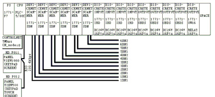 图2为系统中所用的罗克韦尔自动化公司的可编程控制器PLC-5/80C的硬件配置(其自身有内置的远程I/O(RIO)和ControlNet接口)。由于系统中控制的点数多、线路长,因此用了6个1771-SDN扫描器,共12条DeviceNet网络与被控设备相连。12条DeviceNet网络分别命名为1DN1、1DN2、2DN1、2DN2、3DN1、3DN2、4DN1、4DN2、5DN1、5DN2、6DN1、6DN2。其中,1DN1控制生产线上的所有14台变频器;1DN2控制生产线上的所有FlexI/O节点,FlexI/O所连接的大部分设备是原总装生产线上不能直接连接到DeviceNet网络上的设备;2DN1控制车身输送线(积放链);2DN2控制储备线(积放链);3DN1和3DN2控制另一条储备线(积放链);4DN1至6DN2控制整车装配线(工艺链)。整车装配线的工艺非常复杂,由153个工位组成,主要控制功能有工艺急停、与其它设备连锁等;主要设备有底盘打号机、天窗装配机械手、涂胶机械手、装配机械手、风挡玻璃涂胶机器人、驾驶系统控制模块、动力总成、检测装置等。系统共有200多个节点。
