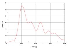 汽车正面全碰撞刚性障碍物是相对简单的一种情况,在实际使用中较常见且危险性更大的是正面偏置碰撞[2],即汽车在正面50%的宽度范围(如左侧)撞向障碍壁,为比较这两种情况的结构变形差异,本文对汽车正面偏置碰撞刚性障碍物进行了模拟仿真。这里只给出了前60ms的结果,图7和图8分别为整体和前舱部分的碰撞变形,图9吸能结构件碰撞力的变化曲线。