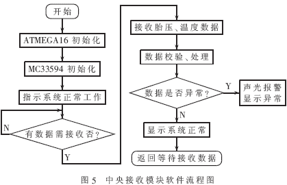 该模块以ATMEGA16为主控制器,在完成初始化后将自身配置为主机模式,通过SPI口对射频接收器MC33594进行初始化,将其配置在315MHz FSK模式下工作,然后又将自己配置成从机模式,等待接收数据。MC33594在接收到从胎压监测模块发送来的压力、温度数据后,由SPI口传送给控制器,控制器在接收数据的同时还要对该数据进行校验和复杂的算法处理,并对处理后的结果进行判断。若当前轮胎内部压力、温度超出了预先预定的范围,则立即启动声光报警,通过蜂鸣器、发光二极管提示驾驶员当前存在异常,同时由LCD将发生异常的轮胎号、胎内信息显示出来;否则提示汽车运行正常。此外,控制器还可以利用键盘设定、更新轮胎压力、温度上/下限值和轮胎ID号,利用串口实现与PC之间的通信,便于查询、分析记录的数据,为优化控制算法和分析交通事故提供依据。