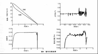仿真参数:车体总质量1850kg;车轮转动惯量20kgm2 ;电磁吸力变化范围0~800N ;制动初速30m/s;重力加速度常数9.8m/s2;车轮滚动半径0.52m;最佳滑移率0.2;峰值附着系数0.8;抱死时附着系数0.7;忽略制动因数随车速的变化,制动因数取常数22。仿真采用五阶变步长龙格-库塔法进行,最大仿真步长为0.5s,最小仿真步长为0.2s。仿真结果如图6所示。