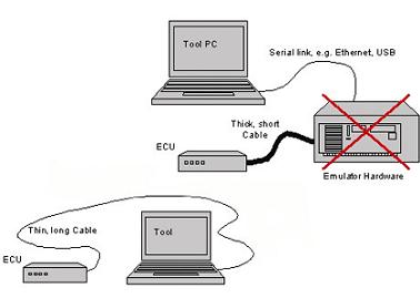 仿真设备使用一个原始生产器件的宏指令,完成所有的一般性功能、外设及端口,接着在外缘添加一个512K的静态随机存取存储器(SRAM)、几个总线观察模块(BOB)及一个拥有一些本地存储器来控制仿真器的局部CPU(在此情况下为另一PCP 2)。若干高速串口,包括USB、JTAG和Micro- Link端口提供了外部连接口。该附加的线路,也叫EEC(仿真扩展芯片),在大规模生产器件发生改变时,使得仿真器很容易被重新设计,因为互连点并没有发生变化。
