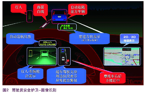 未来车载安全系统还将搭载行车线及前方车辆识别照相机、红外线照相机、后方车况照相机、瞬时检验照相等技术装置。为提高安全性,一辆车将装载 10台以上的照相机。现在汽车厂商正在开发车内监控摄像头的打瞌睡检测和警报装置,及在前方有监控摄像头时的驶离车道报警等技术(图2)。