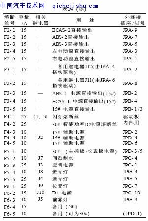 继电器及相关熔断丝的对应关系见表14、表15。