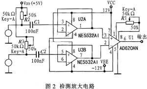 采用驻极体话筒采集语音信号,转换其信号幅值为毫伏级的电信号,系统前级对其处理时,要尽可能提高放大器输入端的信噪比,保证放大电路具有精确、稳定的增益。为此,本文设计了如图2所示的检测放大电路。该电路前级采用电压跟随器,利用输入电阻为无穷大而输出趋于零的特性,提供高输入电阻,实现阻抗变换与隔离;后级采用差动放大器,获得较高的共模抑制比,增强电路抗干扰性。