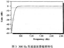 高通滤波器设计指标:通带截止频率fp=300Hz,通带允许最大衰减αp≤3 dB;为消除工频干扰,确定阻带截止频率fs=50 Hz,阻带允许最小衰减as>40 dB。选用两级二阶Butterworth高通滤波器相级联构成.仿真结果如图3所示。