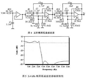 低通滤波器的设计指标为:通带截止频率fp=3 400 Hz,通带允许最大衰减αp≤3 dB;为抑制采样混叠失真,确定阻带截止频率fs=4 000 Hz,阻带允许最小衰减as≥40 dB。由于椭圆滤波器可以获得较其他滤波器窄的过渡带宽,故适用该系统设计。利用滤波器辅助设计软件Filter Wiz Pro获得五阶椭圆低通滤波器电路如图4、仿真结果如图5所示。