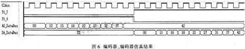 设计完成后,对ADPCM编解码器进行仿真,仿真结果如图6所示。AD_DataBus为编码前输入信号,采用Testbench产生。在编码使能信号P1_7为“0”时,开始编码,P1_7跳变到“1”时,编码被屏蔽。此时解码使能信号P1_4为“0”,开始解码,P1_4跳变到“1”时,解码被屏蔽。可以看出编码前输入信号AD_DataBus和解码器输出DA_DataBus基本符合要求。由于ADPCM算法本身是有损压缩,可以确定本部分的设计是正确可靠的。