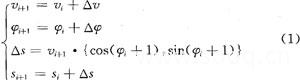 假设在ti时刻,汽车的速率为vi,在x-z坐标系中,汽车的行驶方向与x轴正向的夹角为φi,汽车的位移为si={sxi,szi},那么在ti+1时刻,vi+1,φi+1和si+1可由式(1)得到: