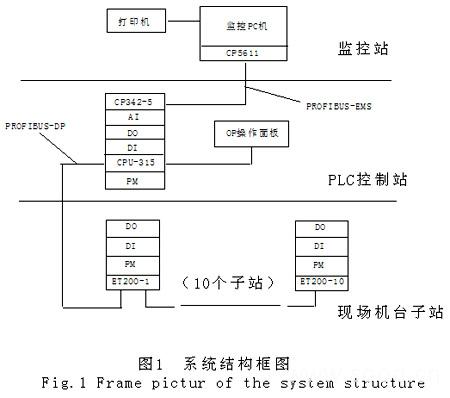根据现场条件和设计思想,整个系统分监控管理层和现场测控层,如图1系统结构框图所示。监控管理层由1台PC机承担,现场测控层由PLC主站和现场机台从站组成。各层通过PROFIBUS工业现场总线连接。
