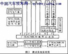 测试和记录系统由磁带记录仪、动态电阻应变仪、稳压电源、信号发生器、二踪示波器、压力传感器及位移传感器等组成。试验中通过仪器测取的参数为压力、角位移和线位移。液压缸的流量通过分别安装在前左轮和后左轮的2个转向缸上的位移传感器的位移计算得出。测试系统的工作原理如图3所示。