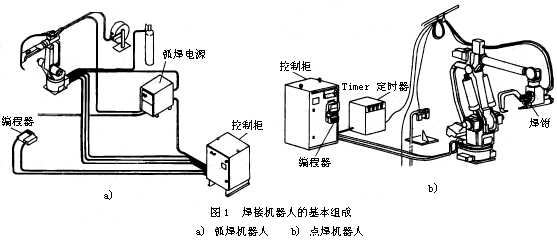 焊接机器人主要包括机器人和焊接设备两部分。机器人由机器人本体和控制柜(硬件及软件)组成。而焊接装备,以弧焊及点焊为例,则由焊接电源,(包括其控制系统)、送丝机(弧焊)、焊枪(钳)等部分组成。对于智能机器人还应有传感系统,如激光或摄像传感器及其控制装置等。图1a、b表示弧焊机器人和点焊机器人的基本组成。