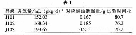 我们用上面介绍的试验方法对一组燃油箱分别进行了渗透试验,试验数据见表1。表1中“透氧量”的单位表示单个燃油箱ld的氧气透过体积,体积计量是在标准大气压下的实验室环境中。通过试验得出了大致的燃油箱透氧量和燃油泄漏量的对应关系,通过这一关系,计算出了表1中的“对应燃油泄漏量”。