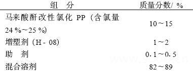 将配方量的氯化PP或改性氯化PP投入配料缸中,在不断地搅拌下,加入混合溶剂、增塑剂、助剂,连续中速搅拌10min,过滤包装。