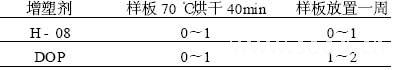 从表7表明,选用H-08增塑剂为佳,因以DOP做增塑剂的涂膜在放置后,附着力下降,有迁移现象,不适于在此类漆中使用。