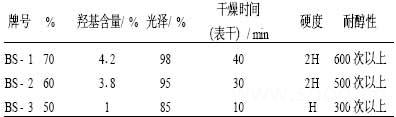 表8表明以BS-1树脂为最佳,溶剂选用苯类、酮类和酯类的混合溶剂溶解效果好,挥发速度适用生产线。