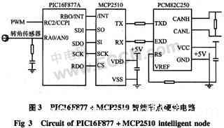 PIC16F877A采用RISC指令系统的高性能8为微处理器,哈佛总线结构、低功耗、高速度。内部集成了ADC、串行外围接口(SPI)和Flash程序存储器,具有PWM输出等多种功能。PIC16F877A通过SPI接口可以实现与CAN控制器MCP2510的无缝连接。