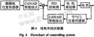 控制系统是一个闭环控制的过程,脚踏板位置传感器作为系统的输入,A/D转换后通过CAN总线发送到控制器。同样,节气门位置传感器作为反馈信号,A/D转换后通过CAN总线发送到控制器,两信号在控制器中进行比较,并由控制器采用相应的控制算法(如PID等)进行决策,决策结果由CAN总线发送到节气门体位置传感器和执行器节点,该节点微处理器产生相应的PWM信号经由驱动装置驱动执行机构的运行。