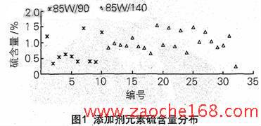 GB 13895对齿轮油的硫含量无明确的要求,齿轮油只需保证通过两个台架试验。在Q/DFLCM4351-2005中规定硫含量要大于1.5%,而发生质量问题油样的硫含量都低于1.5%。这说明,Q/DFLCM4351-2005《装车用驱动桥车辆齿轮油技术条件》企业标准规定的添加剂元素硫含量不低于1.5%的要求可以很好地控制齿轮油的质量。当硫含量低于1.5%时,齿轮油的承载性与极压抗磨性容易出现问题,会引起齿轮异常磨损。