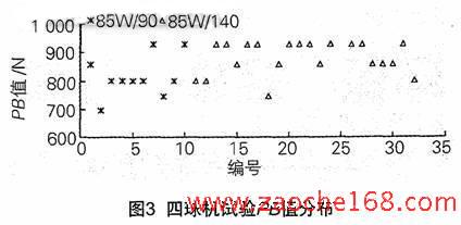 GB 13895采用L-37和L-42试验来评价齿轮油的承载能力和抗擦伤能,力在Q/DFLCM4351-2005中采用四球机试验来评价齿轮油的承载能力和抗擦伤能力,规定四球机试验PB值要大于931N。从检测结果(图3)可以看出,发生质量问题的大部分样品其四球机试验PB值都在931N以下。这表明,Q/DFLCM4351-2005《装车用驱动桥车辆齿轮油技术条件》企业标准规宁的四球机试验PB值不低于931N的要求可以很好地保证齿轮油的极压抗磨性能。当齿轮油的PB值低于931N时,其承载能力和抗擦伤能力不能满足东风公司商用车的使用要求。