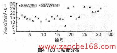 依照Q/DFLCM4351-2005《装车用驱动桥车辆齿轮油技术条件》的要求,GL-585W/90新油100℃粘度在16~24mm2/s之间,一般当在用油的100℃粘度变化增长幅度大于20%或降低幅度大于,10%时则要求更换新油。从100℃粘度分布图(图4)可以看出,对于GL-585W/90,问题样品的粘度值分布在10.63~15.61mm2/s之间,基本在正常值范围之内:而GL-5 85W/140,则分布相当离散,相当一部分样品的100℃粘度降低幅度超过了10%。结束语