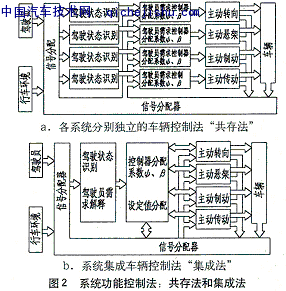 各种各样的执行器功能的重叠必须强调动作的协调性,以避免动作的不协调给车辆的动态稳定性带来不利的影响。各种控制系统用“共存法”安装,并不定能达到预期的效果,最后得到的结果要比理想的效果差得多;“共存法”安装结构另外一个重要的缺陷就是在其发展过程中技术提升的潜力受到限制。由于产品的更新换代,需对技术进行提升时,通常需要了解各单个系统具有的功能数量,对不是同一家公司生产的产品来说,要了解其功能控制方式并破译控制程序是很困难的,所以,这大大影响了产品开发周期和批量化生产。