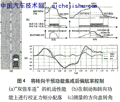 对车辆本身来说,一方面存在的稳定性和可控性之间的矛盾冲突,另一方面要求制动时有较短的制动距离,使用传统的方法解决此问题时比较困难的,在GCC中,采用了主动转向干预的方法来解决,其结果可参见图3。由于较小的摩擦系数,由车辆两侧车轮制动力不同引起的偏航力矩不能通过在较小摩擦系数一侧增加制动系统的压力来补偿,惟一可选择的解决方法就是通过反向转向提供额外的侧向力。使用ESP II,通过驾驶员独立的主动转向干预来实现反向转向,在此过程中,需要驾驶员能够连续地进行转向,通过转向干预实现的偏航力矩补偿也意味着在前轮和后轮的制动压力的建立过程中实际是没有延迟的,这样,制动距离就大大的缩短了,可以缩短10%之多,这取决于车轮两侧摩擦系数的差值和传统的ABS/ESP的配合。因此,制动系统和转向系统都能保持它们的最原始功能:制动系统缩短制动距离,而转向系统实现反向转向。