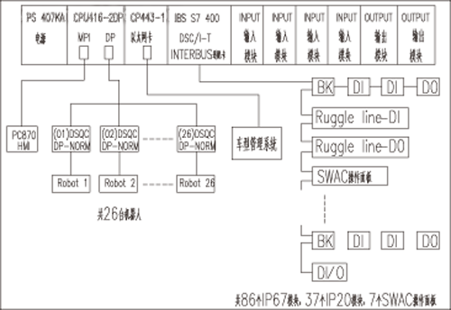 该系统改造的重点是如何实现机器人系统与装配线的合理衔接和控制,以确保全线的全自动运行。全线共配置26台机器人,分别完成涂胶、点焊、搬运等任务。
