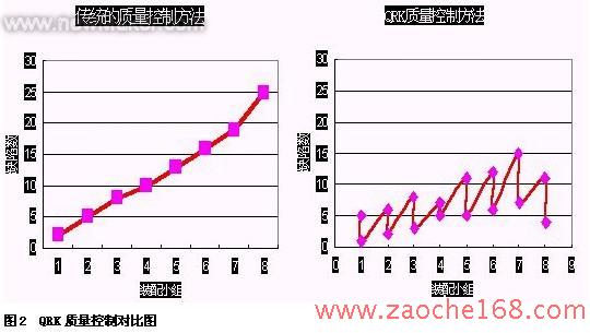 根据QRK的原理,整个生产过程被划分成若干个更小的单元,质量问题及时在单元内被发现,如果可能则直接予以排除,不使缺陷累积至过程末而积重难返。缺陷信息直接反馈给操作者,可以直接消除缺陷的产生原因。缺陷信息内容主要包含缺陷产生的时间、地点、频次、内容、原因以及整改措施等。QRK的建立突破了传统的质量人员归属质量保证部门的做法,使生产部门更多地承担起了质量责任。QRK的基本任务是:检验,将目标值与已测量的实际值进行比较;了解,分析并记录在案;整改,监督和纠正整改效果,并记录效果在案。下图为传统的质量控制和QRK质量控制效果对比图。