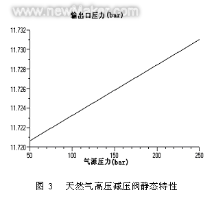 静态特性可以综合描述阀门的活动灵敏性、密封性以及设计的合理性,这些问题所反映出的设计是否合理,最终均可反映在气体减压阀的出口压力偏差大小上。通过设置输出节流口的孔径为1mm其到限流圈的作用,改变天然气气源的工作压力(5-25Mpa)得到输出节流口上游的压力变化,从而绘制出其静态特性曲线如图3,从图中可看出同设定值之差极小。图3中的下降趋势说明,流量下降同时压力也下降。