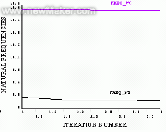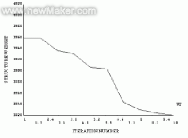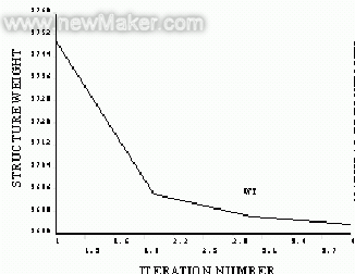 本步骤只考虑在弯扭联合工况下进行截面参数优化,优化的目标函数是客车车身骨架的总质量(WT),状态变量是整车扭转刚度(GJ)。借鉴了一些成功的经验[ ] 4 , 1 ,通过客车车身各部分结构件对整车扭转刚度影响的分析,选取侧围搁梁、腰梁、侧围裙立柱、侧围裙边梁、侧围斜撑、顶盖横梁、顶盖纵梁、底架横梁的截面长度和宽度值作为优化分析的设计变量。车身骨架重量的收敛过程见图3。