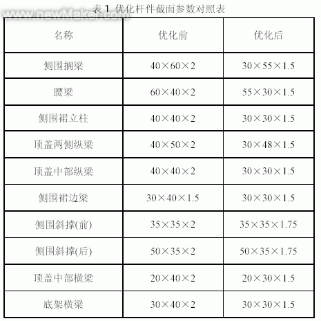 以往成熟的静动态分析一般是在车身结构布局已经决定的情况下进行的,它对于查明车身的应力分布状况、变形状况以及固有频率具有指导意义。现在,许多专家认为,应该在客车车身结构开发过程引入结构优化,它包括初步设计阶段的静态优化和结构布局决定后的动态优化,车身结构动态优化是指车身在现有布局与生产条件下,要求在承受规定载荷的同时,对车身骨架截面参数及形状进行优化,以达到减轻客车自重、降低燃耗、减少排放的目的。
