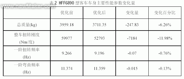 根据市场型材的规格及厂方实际生产条件,对以上优化结果进行标准化,表1 为主要型材优化前后截面参数对照表。通过调整骨架型材的截面参数后,车身主要性能参数变化见表2,经过优化HFF6890 型客车车身骨架总质量减少248kg,而整车的扭转刚度下降7184Nm/度,仍然高于大客车承载式车身扭转刚度的一般水平 。整车骨架总质量和整车扭转刚度下降的同时,车身的一阶扭转频率和一阶弯曲频率却几乎没有变化,分别下降了0.76%和0.13%。可见经过优化后,整车性能满足使用要求。
