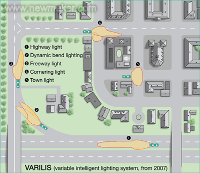 而今,即将登场的AFS,即被海拉公司命名为VARILIS (VARiables Intelligentes Licht-System )的新技术,同样摆动它的前灯模块。革新之处在于,它不仅“投入地”照亮弯道,还可以通过“斜视”自我“扩宽”。这一功能被称作“动态城市照明”:左右大灯各自偏离中轴向外展开11度,大大扩宽了横向照明幅度。这特别适合车速60/80公里每小时的多车道匝道。城镇里,最高时速50公里且道路照明较充足,VARILIS产生城市灯光。照明宽度而不是照明深度起主导作用,AFS柔和而又不眩目。转弯和狭窄弯道行驶时由动态或静态随弯转弯灯照亮车旁的黑暗区域。