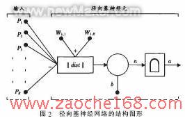 径向基网络的神经元模型结构如图2所示,由图可见径向基网络传递函数radbas是以权值向量和阈值向量之间的距离‖dist‖作为自变量的。其中,‖dist‖是通过输入向量和加权矩阵的行向量的乘积得到的,径向基神经网络的结构如图2所示。