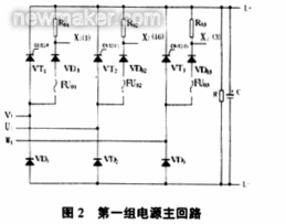 第一组电源主回路由三个晶闸管模块组成整流桥如图2,其中VT1和VD1为一模块,输出端(L+,L-)接滤波电容C和放电电阻R。每相波头信号X2(1,3,16)送控制回路,经处理得相应晶闸管的门极触发信号X2(9,13,11)。
