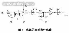 电源的启动条件电路如图3。当控制器发来EIN(启动)信号,光耦I1的1端呈低电位,经施密特非门驱动器IC1B的3,4脚反相为高电位,通过R13给C9充电,消除信号抖动,再经IC1C、IC1D两次反相仍为高电位,分别为三相触发电路和输出正常电路提供开门信号SEIN。