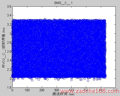从图中可以看到,正常的时间戳由于控制器及算法的特性,存在于一个带状范围内。发生故障的时间戳范围出现断层,这是由于其它信号在断层时间内插入,并且通过仲裁获得了优先发送权,导致发送的时间(128bit / 250kbps ~= 0.512ms)内,原有CAN信号无法发送的缘故。