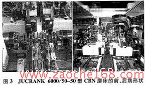 图3是JUCRANK 6000/50-50型数控曲轴磨床。该磨床具有4片CBN砂轮,每片均可独立磨削,一次装夹可磨削全部主轴颈和连杆颈(摆动跟踪磨削)。