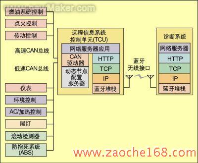图1显示了使用基于蓝牙的诊断系统进行访问的车内网的网络架构。具有蓝牙功能的常规笔记本电脑上的网络浏览器是用来访问TCU的,它提供了一个访问汽车网络的用户接口。通过在汽车自身嵌入诊断接口,制造商可以定制数据的描述形式和提交给技术人员的过程。还可以根据特定汽车内的选件安装情况来提供诊断程序。除了消费者挑选的诸如空调、ABS等选件之外,通常还有一些其它的部件差异是消费者所看不见的。例如,在1个型年内可能使用2~3个水泵。把所有这些差异都考虑进去之后,可能会出现几十种组合情况。对特定汽车定制专门的诊断接口降低了导致技术人员陷入迷惘和使用不正确诊断程序的可能性。