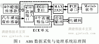 系统电控单元ECU不断从车轮角速度传感器和汽车减速度传感器读入信号,一方面利用这些信号计算出车轮的角加、减速度和参考滑移率,然后与设定的门限值进行比较,从而控制电磁阀的输出;另一方面则将这些信号通过串口发送到ECU的串口和PC机串口互联,可以在对原ABS系统和车辆环境不做任何改动的前提下,实时采集与存储ABS内部运动过程。