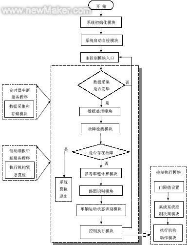 汽车ABS/ASR/ACC 集成化系统的软件模块主要由系统初始化模块、启动自检模块、主控制模块、数据采集模块、数据处理模块、参考车速计算模块、路面识别模块、车辆运动状态识别模块、控制决策和执行机构动作模块、故障诊断模块、通讯模块等几大部分组成,各模块由主控制模块按任务管理机制实时进行统一调度,分配运行时间,进行数据和信号的交换。总体框图如图8 所示。