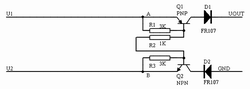 如图4所示,分析单路中两个三极管导通的过程。当两个三极管的导通时间不同时,如果一个三极管处于导通状态,而另外一个尚未导通,此时UOUT和GND中一端由于三极管导通而与输入电压(U1或U2)电位相同,而另一端则由于三极管没有导通而处于未知电平状态,如果此未知电平小于输入低电平,则可能在三极管导通的瞬间产生尖峰。在两个三极管关闭的时候亦然。