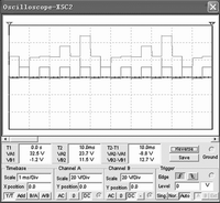 下面测量实际电路的波形,首先接入6路左右的16V电池组,用示波器观察输出回路中UOUT与地线之间的电压。第一路电池组导通时,输出电平左端有尖峰出现,实际波形与分析的吻合,搭建的仿真模型有效。