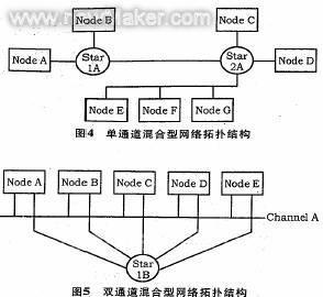 共有3种网络拓扑结构,即:总线型(Bus)、星型(Star)和混合型(Hybrid)。而每一种类型都有单通道(SingleChannel)和双通道(DualChannel)之分。在星型结构中,还存在联级方式。总线型如图1所示,单、双通道联级星型如图2、图3所示,单、双通道混合型结构如图4、图5所示。