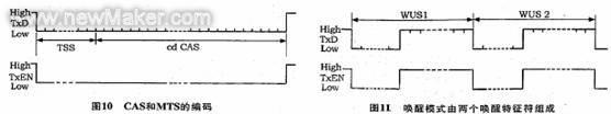 节点对唤醒特征符(WUS)的编码并没有采用辅助信号TSS,随TxEN的边沿触发同步于TxD信号进行传输一个唤醒特征符(WUS),如图11所示。