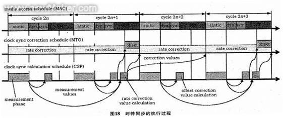 时钟同步包含两个主要过程:最大时钟节拍产生过程(MTG)和时钟同步过程(CPS)。如图18所示。MTG控制时间片计数器初值,并对其进行修正。时钟同步过程(CPS)主要完成一个通讯周期开始的初始化,测量并存储时间偏差值,计算频率与相位的修正值。时间偏差可以分为相位(offset)和频率(rate)偏差。相位偏差是两个时钟在某一特定时间的绝对差别频率偏差是相位.偏差随着时间推移的变化,它反映了相位偏差在特定时间的变化。FlexRay同时对频率与相位进行修正。节点计算数据帧到达的实际时刻,并与理论上的预测时刻比较,得到的值就是发送节点与接收节点的时间偏差,并采取一定的算法进行修正,最终使簇内的节点上的时间实现“同步”。