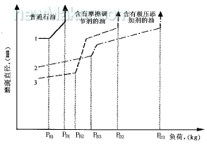有人认为PB点为弹性流体动力润滑的临界点,也即在该点弹性流体动力润滑膜将达到极小值,负荷再增大,该膜就将破裂,B点后反映了油性剂或减磨剂的贡献。本文认为,AB点之间不可能是弹流润滑,只可能是薄膜润滑或边界润滑,否则不可能有磨痕。AB段的前面部分可能是有序膜起主要作用,后半部分边界吸附膜起主要作用。BC之间是吸附膜逐渐消失、化学反应膜逐渐形成的时期;CD之间是化学反应膜起作用的阶段。所以PB代表有序膜的终止点。只有这样,才能解释PB与油性剂、极压添加剂的加入有关,这些添加剂的极性,可能增加了有序膜的厚度。PD值的大小,代表了化学反应膜的形成难易和抗磨性能,PD值高,表示化学膜失效的温度高。但反应膜润滑是以腐蚀磨损为代价的,但若腐蚀性太强,将影响其抗磨性。