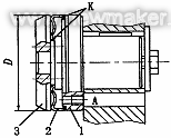 在以曲轴孔为主要定位基准的夹具中,曲轴孔加工精度的高低是保证曲轴孔与顶面、缸孔相关精度的先决条件,曲轴孔应保证较高的同轴度和孔径精度(不低于IT7),其次是曲轴孔定位销的结构形式也是保证缸体加工精度的重要因素。目前有可涨芯轴和固定芯轴两种结构形式,可涨芯轴的使用须满足以下条件:(1)在工作状态时可涨套的外圆径向跳动应小于0.01;(2)可涨套直径的变化应能保证均匀地消除与芯轴、曲轴孔之间的间隙;(3)可涨套的材料应具有较高的疲劳强度及寿命。固定芯轴在保证自身的高精度、高寿命外,对曲轴孔精度的要求也大大提高,除要求高的同轴度外,孔径精度不应低于IT6。图4为可涨定位芯轴的结构形式(一),涨套2与芯轴1沿直径D和d用真空电子束的方法焊接在一起(箭头K指处),其工作原理如下:在两芯轴插入曲轴孔后,借助专用支承来定准缸体底平面,然后通过芯轴1上的孔A把压力油通入涨套内,消除件2与曲轴孔的间隙,使缸体略微抬起后正确定位。
