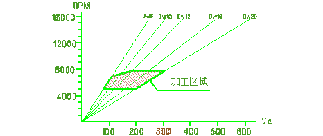 在通常的思维中,有一个误区,那就是人们更关心数控机床的转速,往往忽略刀具的额定线速度。实际上,每种刀具都有其适宜的加工范围,其线速度是一定的。以最常用的SANDVIK硬质合金球头刀为例,我们根据多年的实践经验总结出较适合本厂情况的加工区域(见图1)。