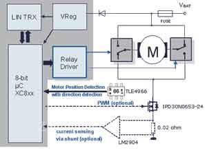 12V的VBAT电压同时接TLE7810和执行电机以供电,TLE7810中的8位单片机通过LIN总线与主控制器(司机侧)通信,它的两个低边开关与Relay连接以控制开关的接通与关断,进而驱动H桥控制电机。霍尔传感器TLE4966采集电机工作信息作为反馈送回MCU。反馈的内容包括电机位置和转动方向两个信息,以便更加精准地记录的电机工作情况,进而对车窗升降和电机的堵转进行控制和识别,提高工作性能。此外,PWM调压方式作为可选配置也列入设计范围。